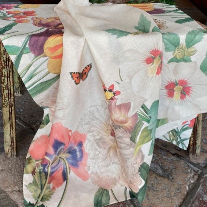 Scopri la nostra tovaglia di lino, adornata da deliziosi disegni di fiori. Un connubio di eleganza e freschezza per una tavola che celebra la bellezza della natura in ogni occasione.