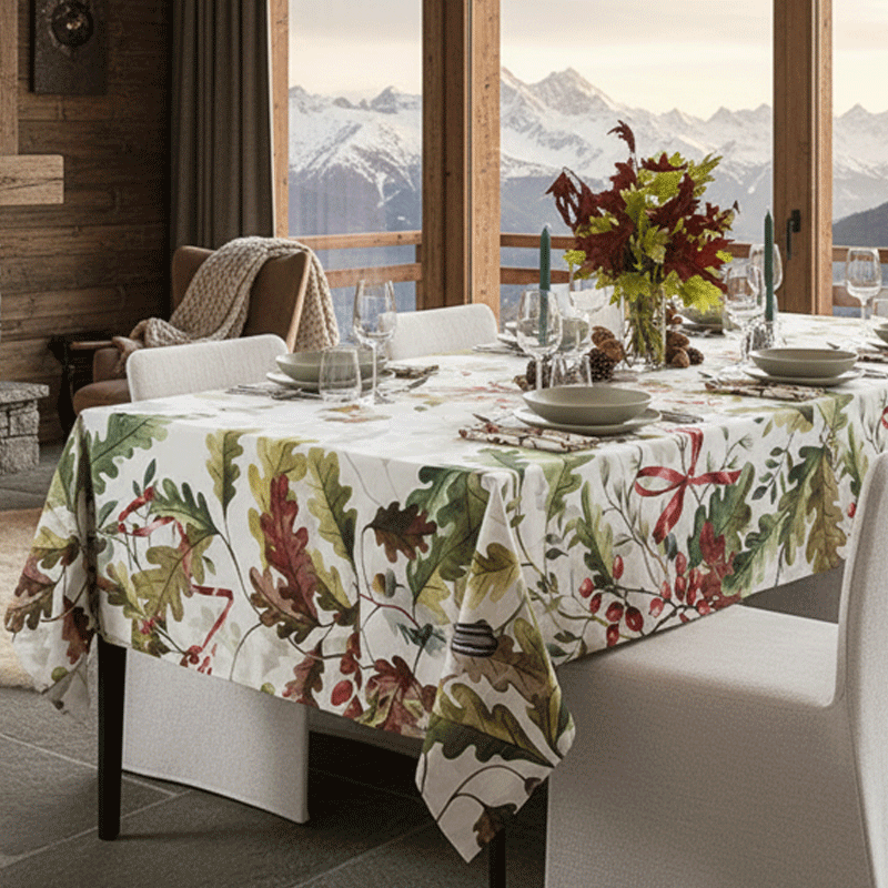 Questa tovaglia in puro stile naturale celebra i colori caldi e avvolgenti dell’autunno-inverno. Il tessuto chiaro fa da sfondo a un raffinato motivo botanico dipinto ad acquerello, dove foglie di quercia, rami, bacche rosse e tocchi di verde creano un’armonia vivace ma sofisticata.