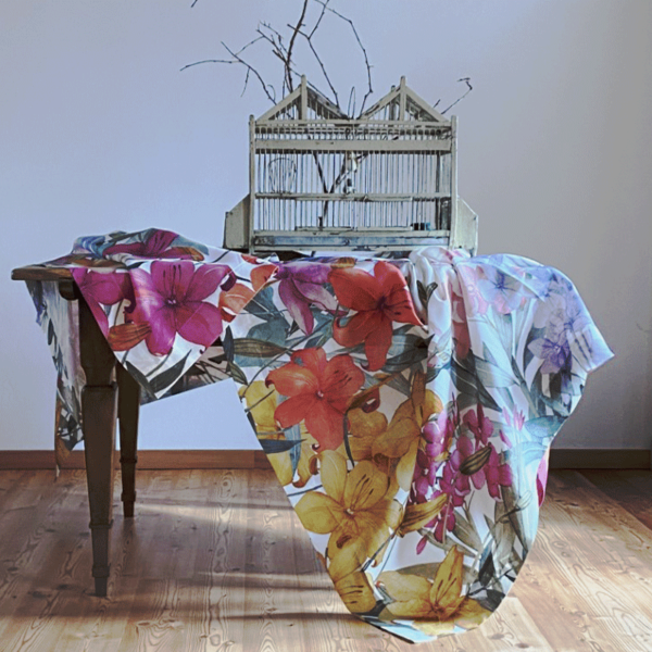 Scopri la nostra tovaglia di lino di alta qualita’con disegni di oleandri di diversi colori: un tocco raffinato per la tua tavola. Perfetta per celebrare quasiasi festa.