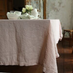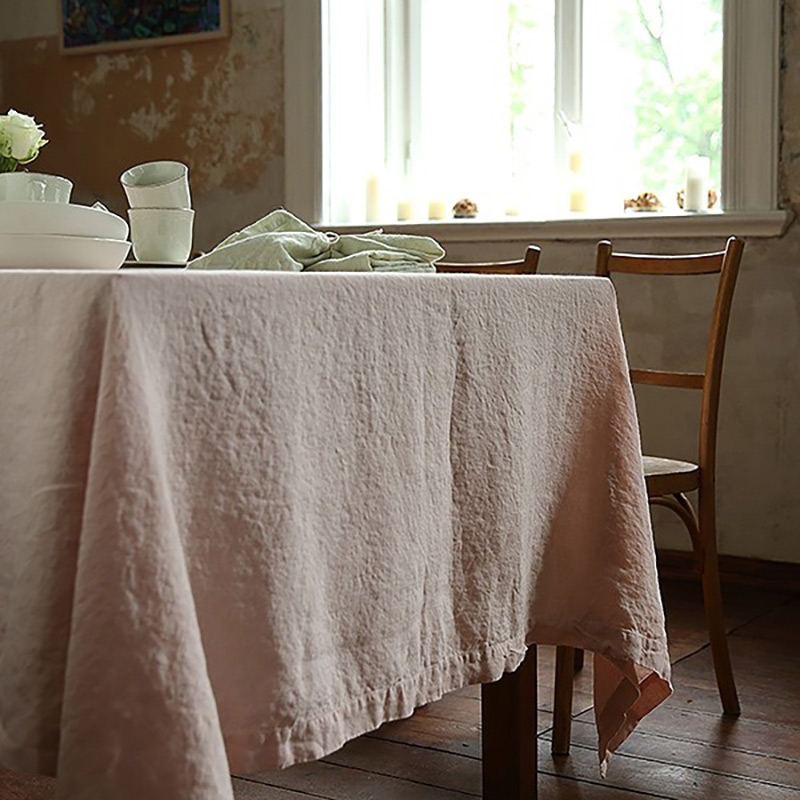 Tovaglia Stone Washed rosa. Queste tovaglie sono tagliate a mano una ad una e rifinite con un angolo mitrato, mantenendo la tradizione di alta qualità di tutti i nostri prodotti.
